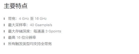 >带宽:4GHz-16GHz >记录长度:3Gpts >通道数:4 >采样率:高达40GSa/s